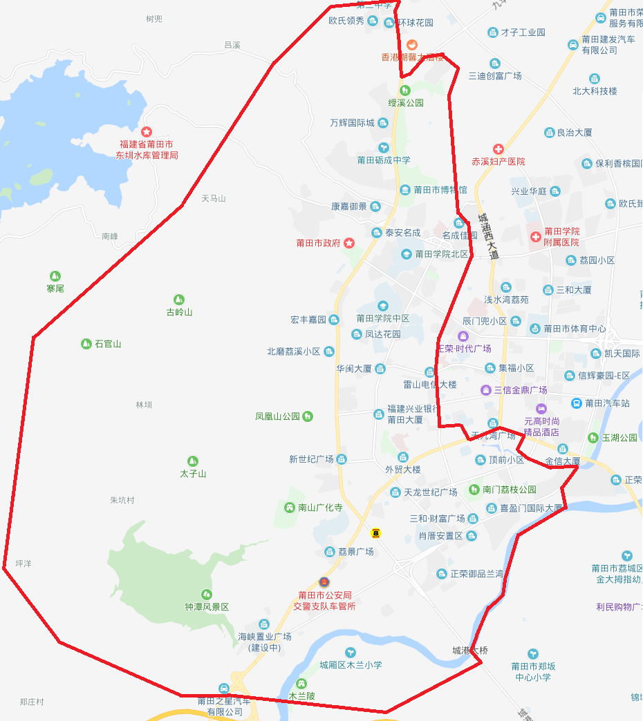 秀屿区:笏石镇北埔村、健康产业园以及清塘大道(假日酒店至涵港大道交汇点)以南;荔港大道(假日酒店至靖安路交汇点)以东;靖安路(西田工业区至秀屿人民检察院)以北;秀屿大道、笏石往北高旧路、涵港大道(秀屿人民检察院至大丘村至涵港大道与清塘大道交汇点)以西的区域内,月塘镇坂尾村,东峤镇东峤村峤江社区,埭头镇埭头村,平海镇平海村,东庄镇营边村及福建中原港务周边(东庄镇莆头村村部到中原港务公司前门和后门村道围成区域内),中海油福建有限公司(LNG)周边(秀屿区东庄镇青峰岩及周边500米区域内),笏石工业园,临港工业园区,木材加工区,上塘珠宝城。