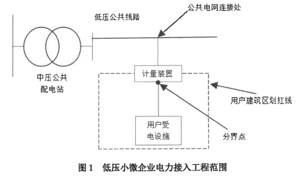 低压小微企业项目电力接入工程范围为计量装置至公共电网连接处的所有电力工程,计量装置出线下桩头为分界点,分界点电源侧供电设施属于电力接入工程范围,负荷侧受电设施由用户投资建设。