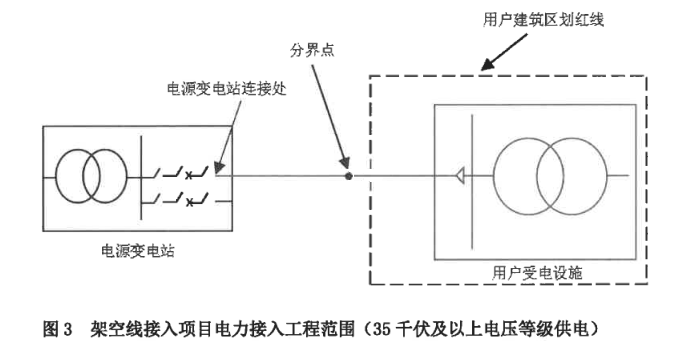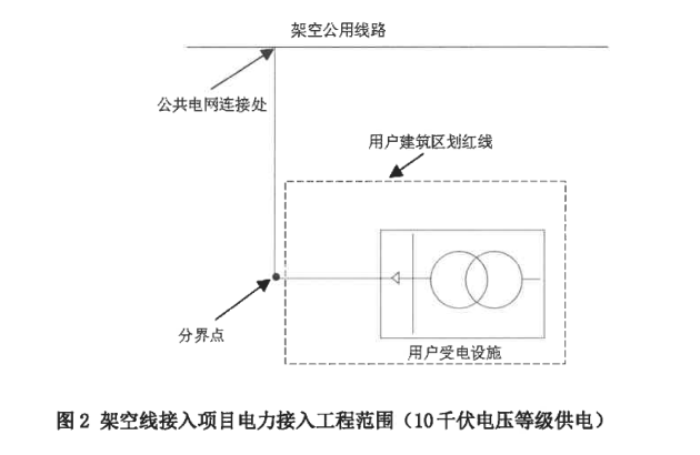 (一)架空线接入项目电力接入工程范围为用户建筑区划红线外第一断路器或第一支持物至公共电网(35千伏以及上电压等级供电项目,为电源变电站)连接处的所有电力工程,以用户电源线路接入用户建筑区划红线处第一断路器或第一支持物的连接点为分界点,分界点电源侧供电设施属于电力接入工程范围,负荷侧受电设施由用户投资建设。
