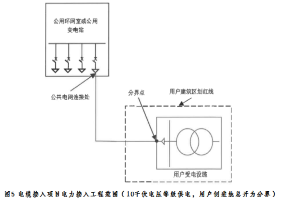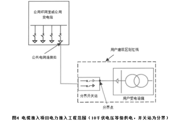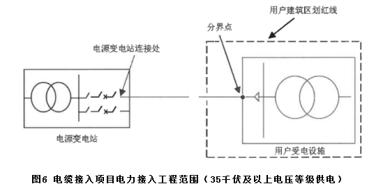 (二)电缆接入项目电力工程范围为建筑区划红线内分界开关站(或用户侧进线总开关)至公共电网连接处(35千伏以及上电压等级供电项目为用户侧进线总开关至电源变电站连接处)的所有电力工程,以用户电源线路接入分界开关站的连接点(35千伏以及上电压等级供电项目为用户侧进线总开关上桩头)为分界点,分界点电源侧供电设施属于电力接入工程范围,负荷侧受电设施由用户投资建设。