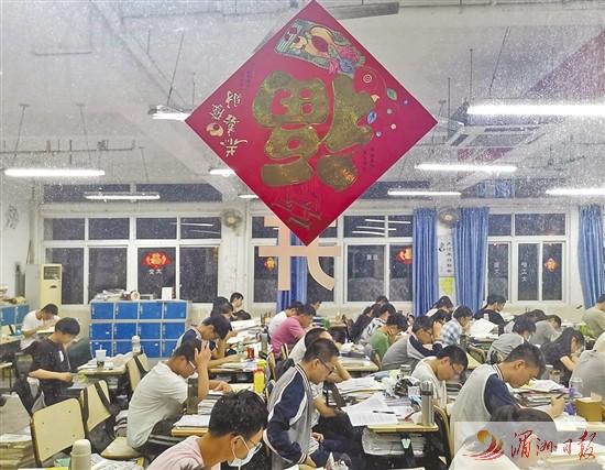 昨晚,莆田四中考点,考生们在贴着“福”字的教室里争分夺秒复习。吴伟锋 摄