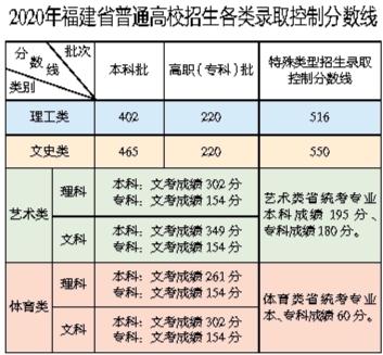 昨日下午3点许,2020年福建省普通高考成绩公布,普通高校招生各科类各批次录取控制分数线也划定(见图表)。今年分数线划定与往年不同,本科一批、二批合并为本科批;增设特殊类型招生录取控制分数线;高职(专科)批不变。
