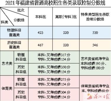 昨日下午,2021年福建省普通高考成绩公布,普通高校招生各类录取控制分数线也划定(见图表)。今年是福建“新高考”第一年,与往年理工类、文史类不同,科类设置为物理科目组普通类、历史科目组普通类。
