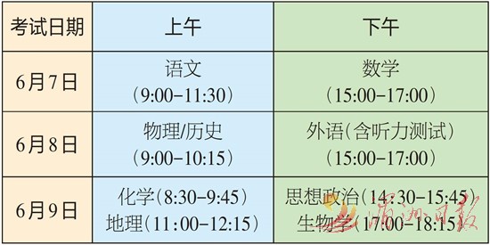 今年高考6月7日至9日举行(考试时间见图表),为期3天。我市共设6个考区、21个考点。