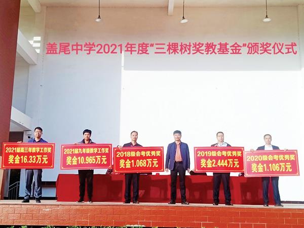 12月9日,仙游县盖尾中学2021年“三棵树奖教基金”颁奖大会举行,共有130多位教育教学成绩突出的优秀教师获得32万元奖教金。当日获奖的陈芸丽老师说,“我要将这份奖励化作无限的动力,更加勤奋敬业,甘作园丁、乐为人梯,为农村教育振兴贡献自己的梦想与激情,培养更多的栋梁之才!”至此,杰出校友洪杰2009年首设的“三棵树奖教基金”已连续13年对盖尾中学优秀教师进行奖励,累计发放270多万元奖励金。