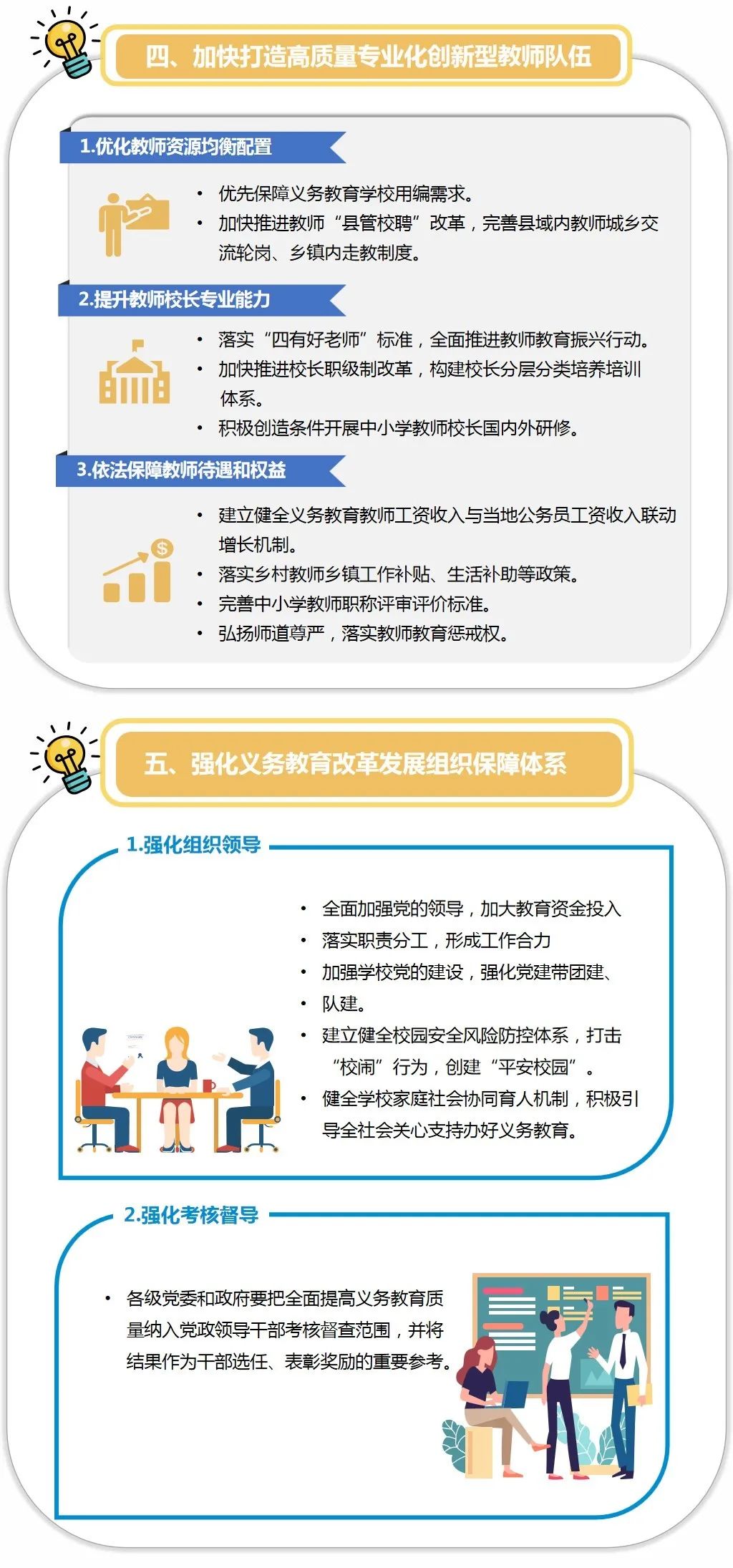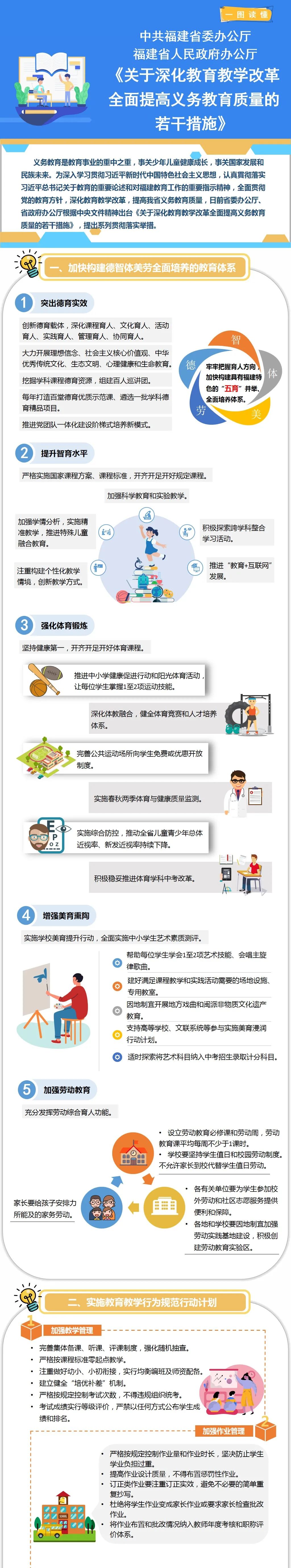 近日,中共福建省委办公厅、福建省人民政府办公厅印发通知,要求全省各地认真贯彻落实《关于深化教育教学改革全面提高义务教育质量的若干措施》的要求,加快构建“五育”并举全面培养的教育体系,实施教育教学行为规范行动计划,加快打造高质量专业化 创新型教师队伍,强化义务教育改革发展组织保障体系,推动我省义务教育优质均衡发展。