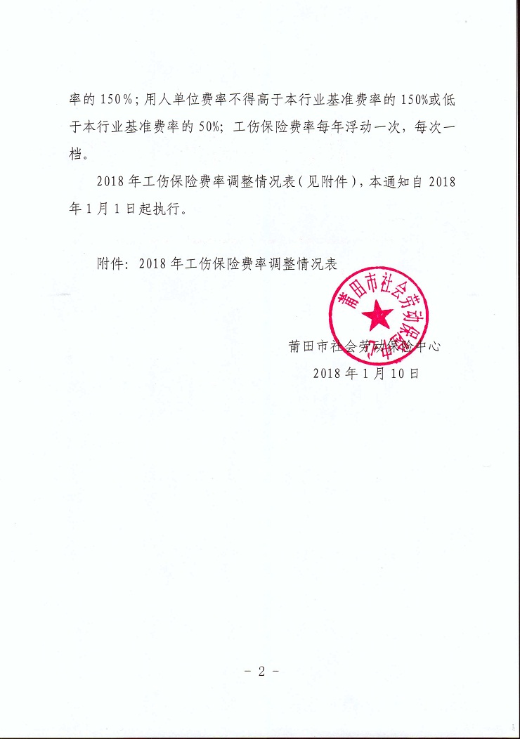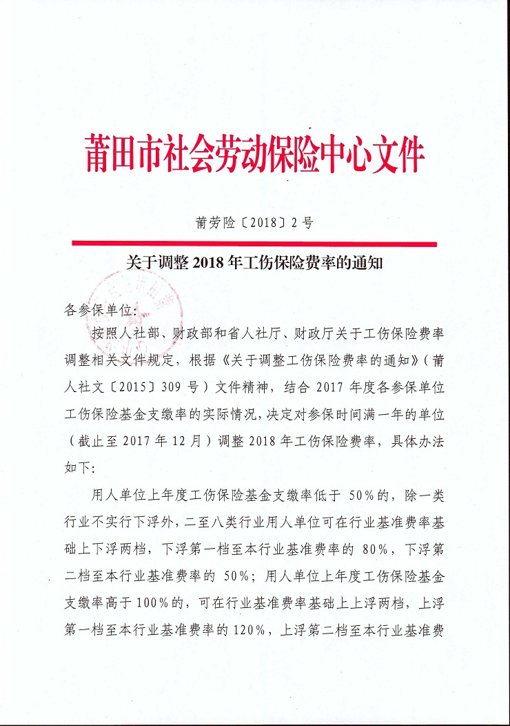 莆田市社会劳动保险中心关于调整2018年工伤保险费率的通知