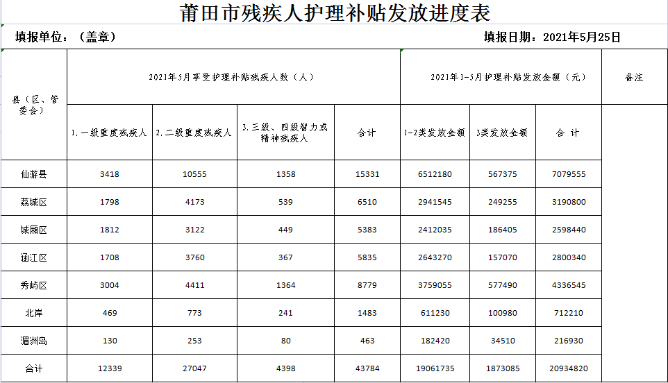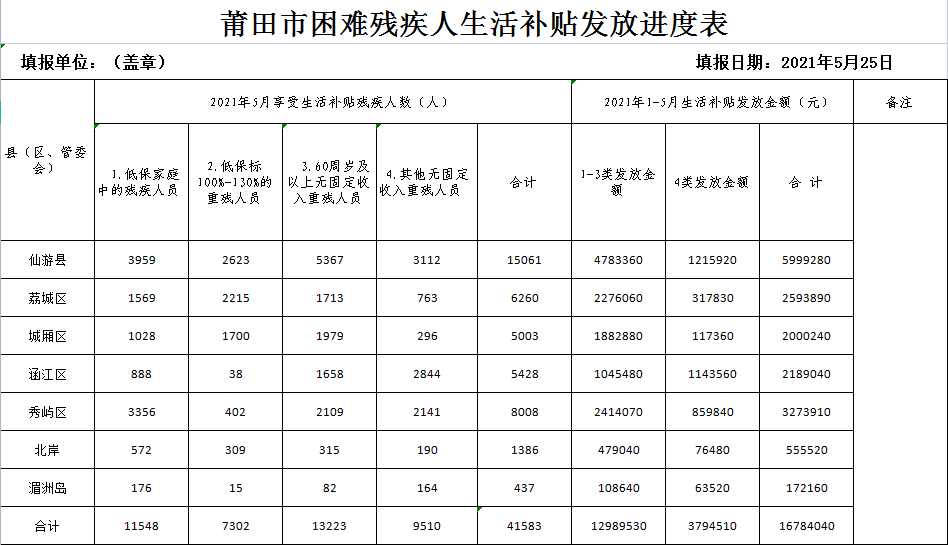 2021年5月莆田市残疾人“两项补贴”发放统计表
