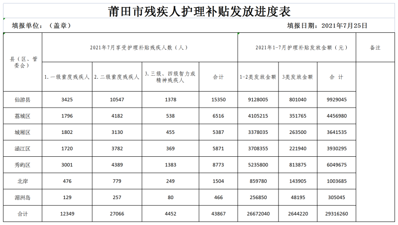 2021年7月莆田市残疾人“两项补贴”发放统计表