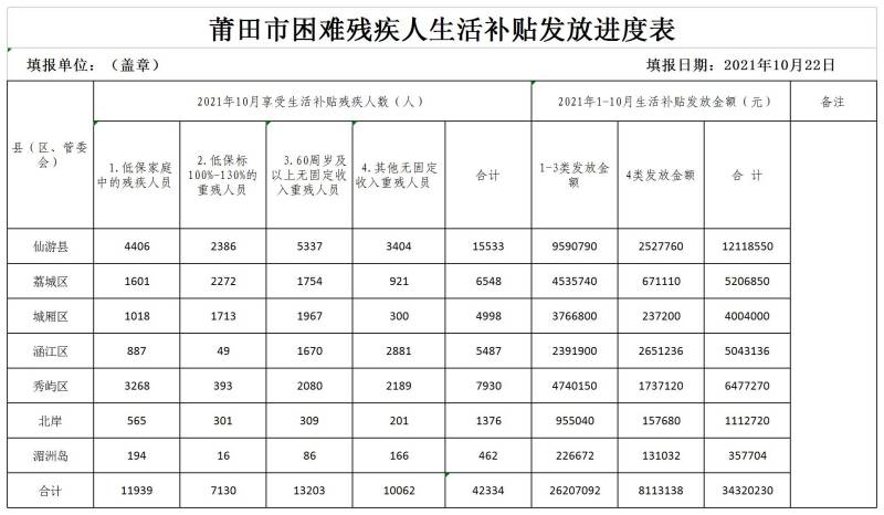 2021年10月莆田市残疾人“两项补贴”发放统计表