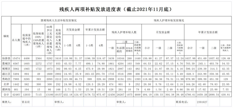 2021年11月莆田市残疾人“两项补贴”发放统计表