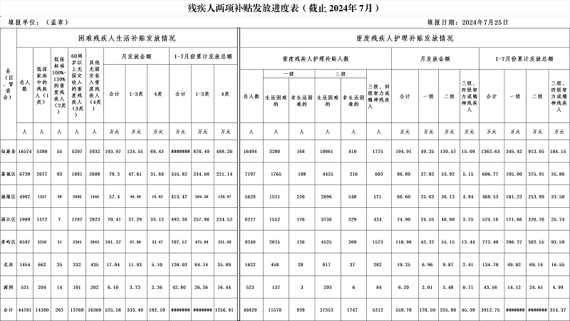 2024年07月份残疾人两项补贴发放进度表