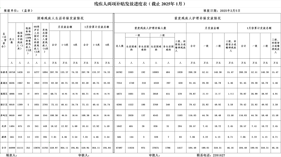 2025年1月份残疾人两项补贴发放进度表