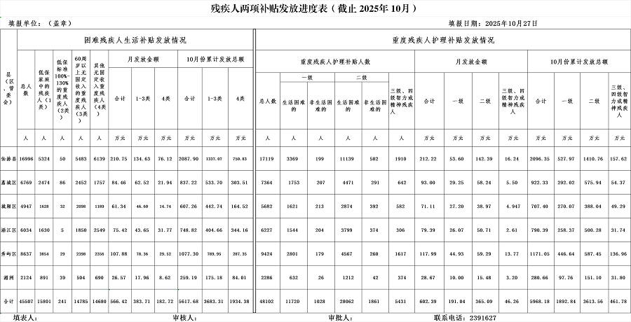 2025年10月残疾人两项补贴发放进度表