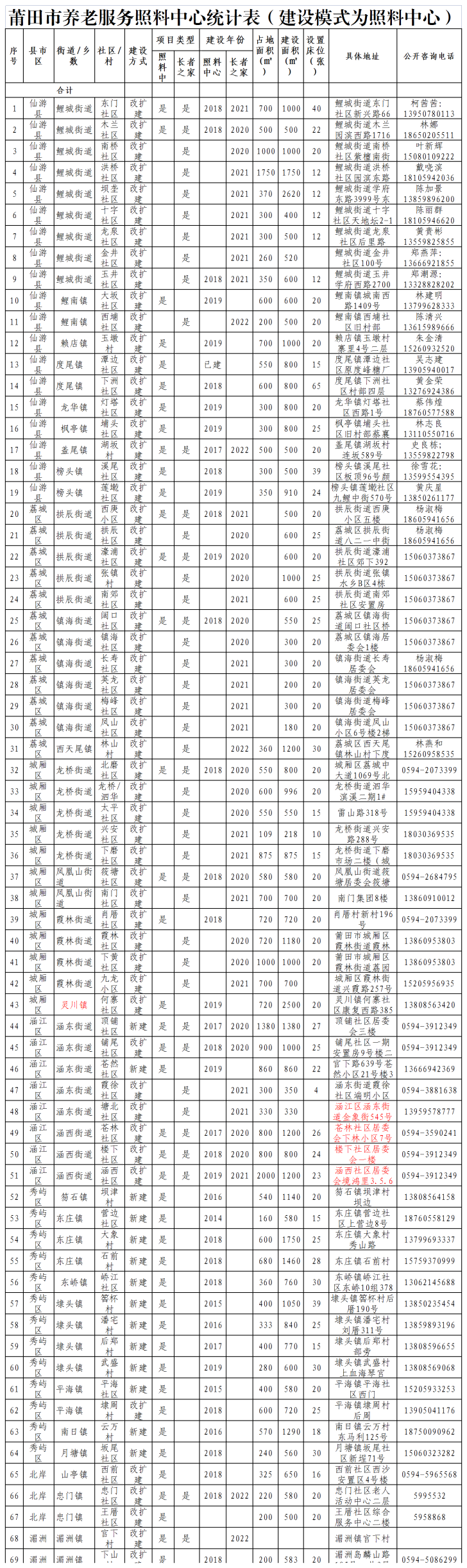 莆田市养老服务照料中心统计表(建设模式为照料中心)
