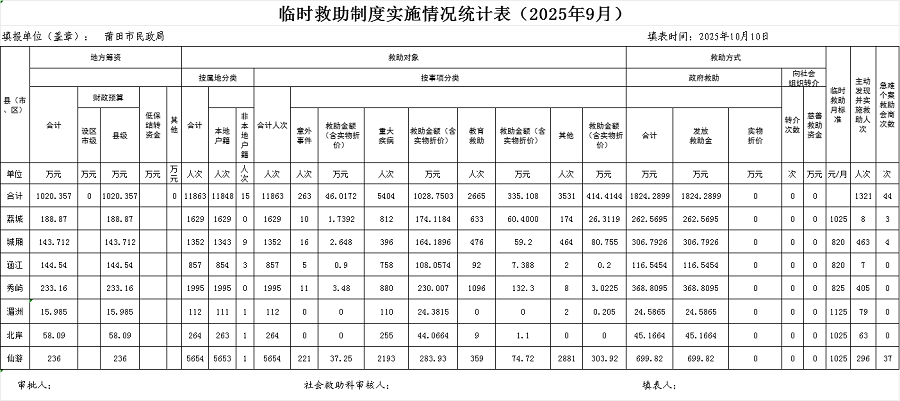 2025年9月临时救助月报统计表