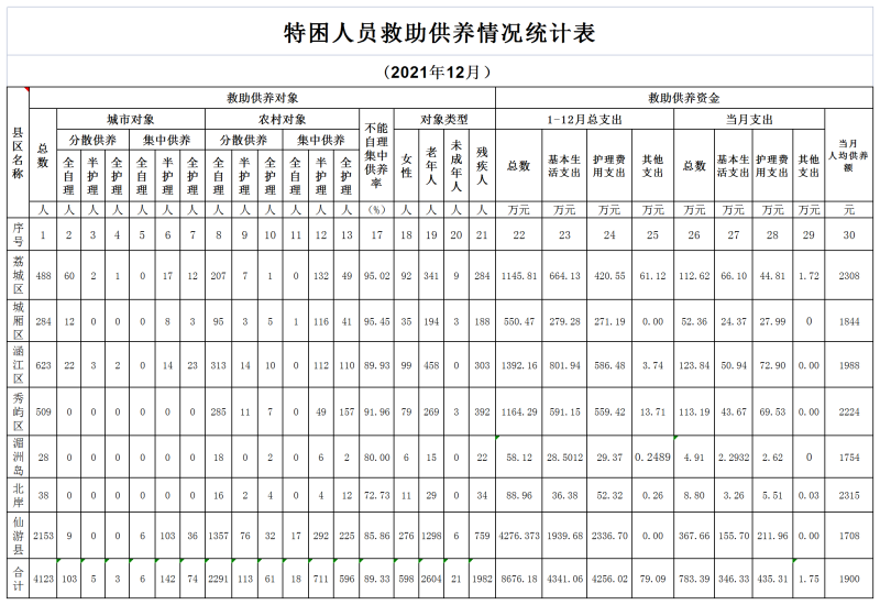 2021年12月特困人员救助供养情况统计表