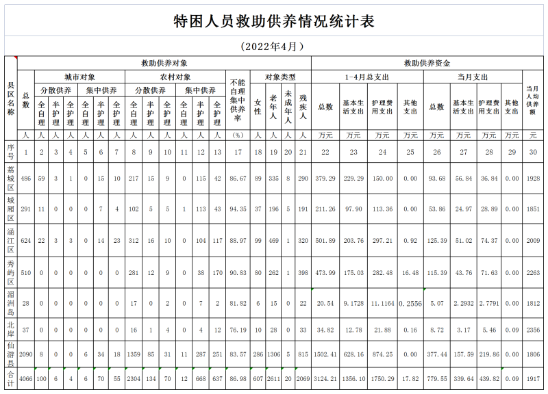 2022年4月特困人员救助供养情况统计表