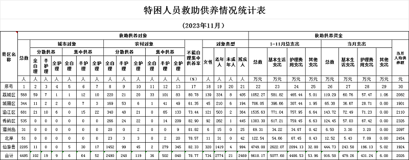 2023年11月特困人员救助供养情况统计表