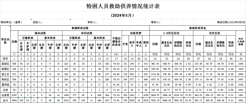 2024年08月特困人员救助供养情况统计表