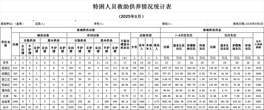 2025年8月特困人员救助供养情况统计表