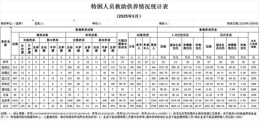 2025年9月特困人员救助供养情况统计表