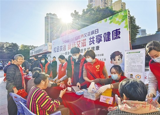 为营造全民参与艾滋病防治的良好氛围,提高公众对艾滋病的认知,11月29日,市卫健委、市公安局、市总工会、市妇联、市疾控中心等联合在市区馨宜新天地广场开展“世界艾滋病日”宣传活动(如图)。
