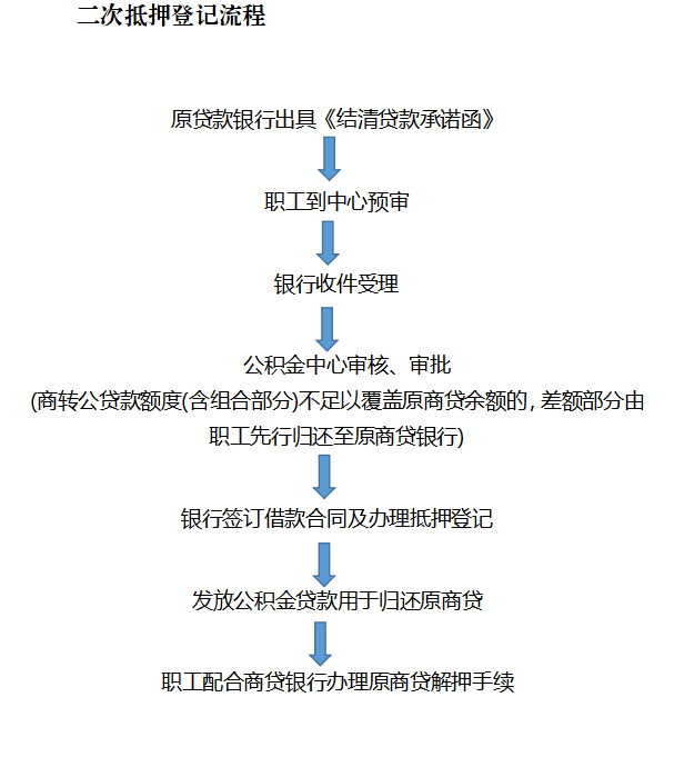 指运用不动产二次抵押登记模式,申请商转公贷款的职工申请公积金贷款直接用于偿还部分或全部商业贷款余额。目前,只能在原商贷银行与委托商转公贷款银行一致时办理。
