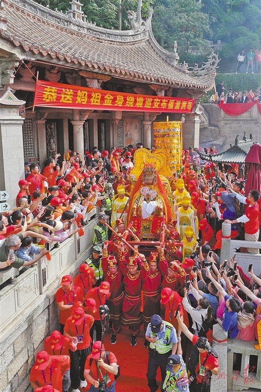 今年是妈祖信俗列入《人类非物质文化遗产代表作名录》15周年,10月9日,为期5天4夜的纪念妈祖羽化升天1037周年暨妈祖金身巡安湄洲岛拉开序幕。包括台湾地区上百家妈祖宫庙逾千名台胞在内的两岸同胞倾情参与,以实际行动深化落实“发挥妈祖等民间信仰精神纽带作用,开展形式多样的民间信俗交流活动”要求,生动展现《中共中央 国务院关于支持福建探索海峡两岸融合发展新路 建设两岸融合发展示范区的意见》发布一周年来两岸深度融合的新成效。