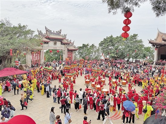 漳州龙文区东屿天后宫、泉州惠安县小岞镇后顶头妈祖宫……随着一支支进香队伍陆续抵达,妈祖敬仰者们身着传统服饰,沿着台阶拾级而上,谨循祖制,虔诚进谒。圣旨门广场上,锣鼓阵阵、人声鼎沸,丰富多样的民俗表演精彩纷呈,吸引游客驻足观看(如图)。
