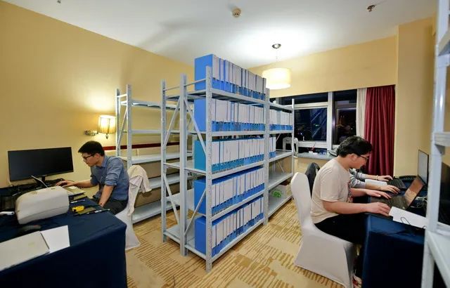 11月22日晚,中央第一生态环境保护督察组工作人员正在资料室整理资料。摄影/章轲