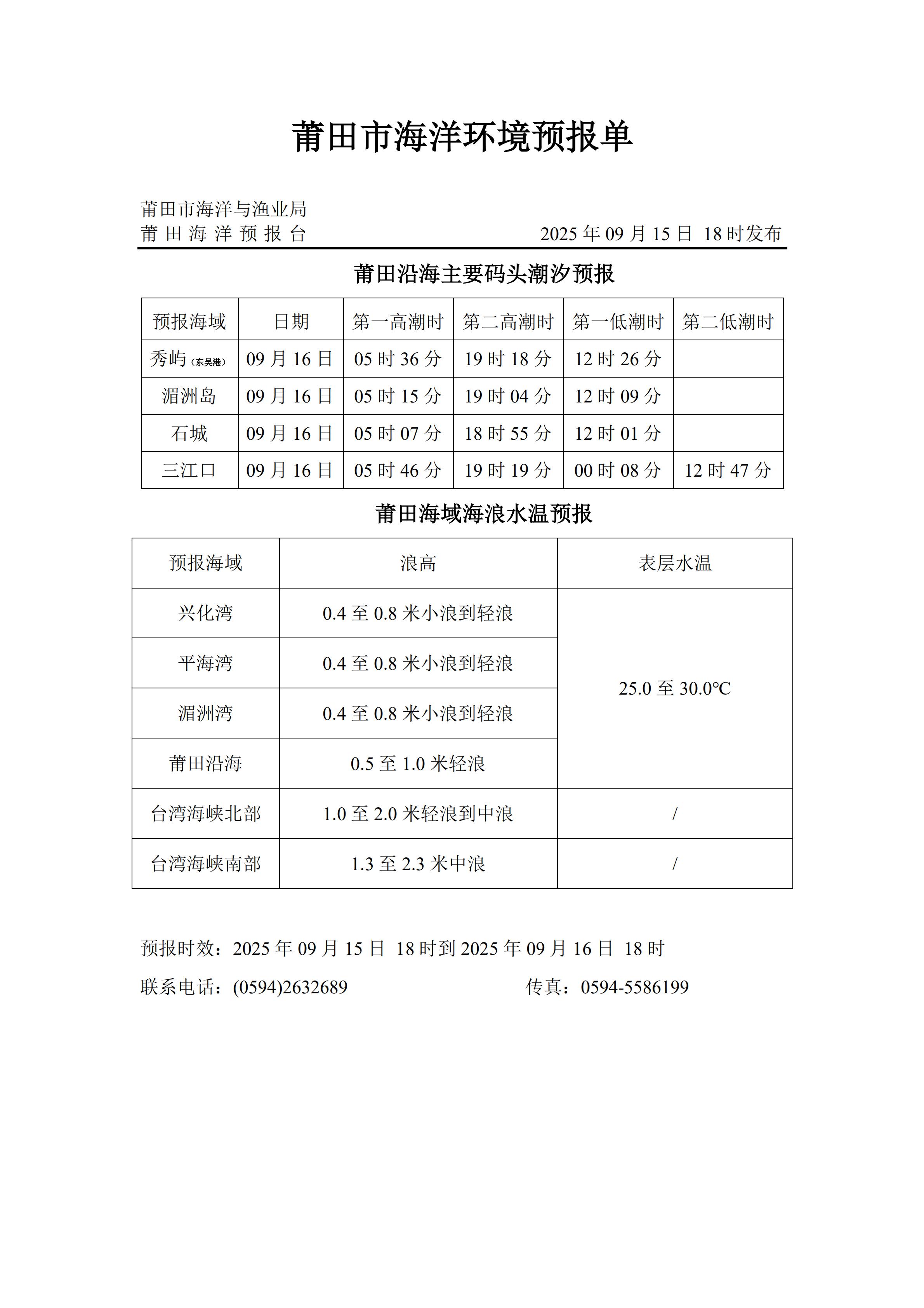海洋环境预报(2025年9月15日发布)