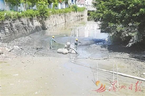 连日来,荔城区持续开展木兰溪流域水环境综合治理,推动水质不断提升。图为近日,施工人员正在用高压水枪冲洗阔口渠河底淤泥。何晋生 摄