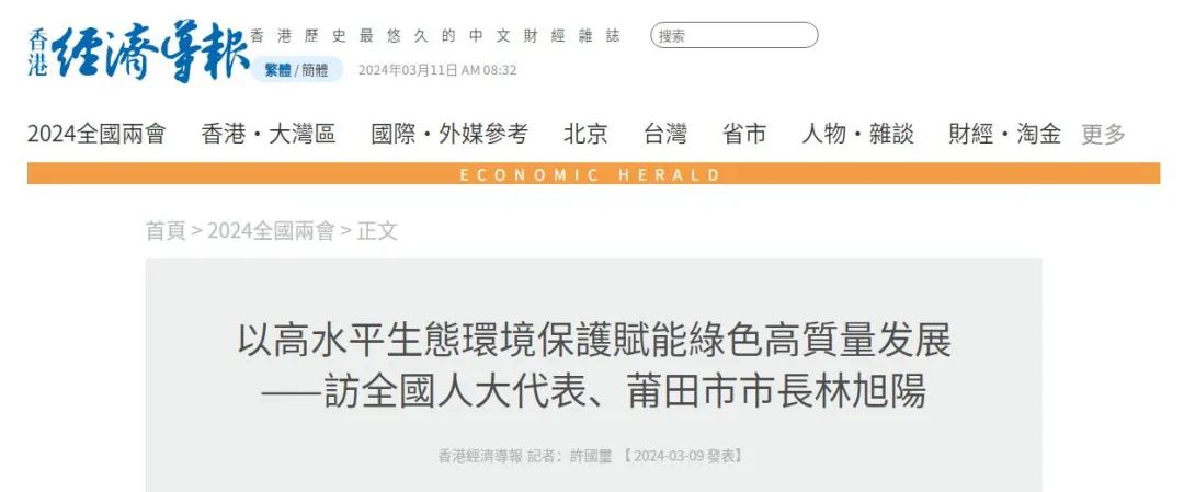 林旭阳:建设美丽中国是习近平总书记着眼推进中国式现代化战略全局作出的重大决策部署,去年12月,党中央、国务院专门印发《关于全面推进美丽中国建设的意见》,绘就了美丽中国建设的新画卷。这次李强总理在政府工作报告中也指出,建设人与自然和谐共生的美丽中国。新征程上,莆田市将接续奋斗,努力在美丽中国建设的伟大实践中走在前、做示范。一是践行绿色使命,共塑生态之美。坚定践行习近平总书记治理木兰溪的重要理念,开展木兰溪下游水生态治理与修复、南北洋河网整治等项目,创建木兰溪源国家级自然保护区、木兰溪口省级湿地公园,推动木兰溪全流域国省控断面水质优良比例保持100%;全面开展木兰溪南岸全域土地综合整治及生态修复全国试点,加强绿心保护,建设省水博物馆,将木兰溪打造成为践行习近平生态文明思想的全流域展示带、全要素展示馆、全景式展示轴。牢记习近平总书记保护好湄洲岛的重要嘱托,推进全海岛风貌提升整治工作,推进全国水系连通及水美乡村建设试点,争取创成全国首座零碳岛。二是壮大绿色经济,共筑生态之基。坚持绿水青山就是金山银山的发展理念,坚持数字化转型、智能化改造、绿色化生产,推进传统产业升级、新兴产业壮大、未来产业培育,加快发展新质生产力。同时,严把项目准入门槛,旗帜鲜明讲投资效益、讲亩均税收,让发展成色更具“含绿量”“含金量”。三是托起绿色民生,共享生态之福。扎实推进中央第三轮生态环境保护督察整改,深入推进环境污染防治,持续打好蓝天、碧水、碧海、净土保卫战。统筹生态廊道和景观视廊建设,推动“莆阳福道”“水上巴士”串珠成链,新建一批郊野公园、口袋公园、城市绿地,加快打造山水诗画的生态韵城;深入实施乡村建设行动,持续提升农村人居环境、持续完善农村基础设施,持续打造美丽乡村样板,让生态文明的建设成果惠及全市人民。