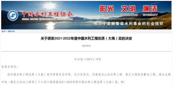 中国水利工程优质(大禹)奖简称“大禹奖”,是全国水利行业优质工程的最高奖项,获奖工程均为建设规范、设计优秀、施工先进、质量优良、运行可靠、效益显著的工程,达到国内领先水平。