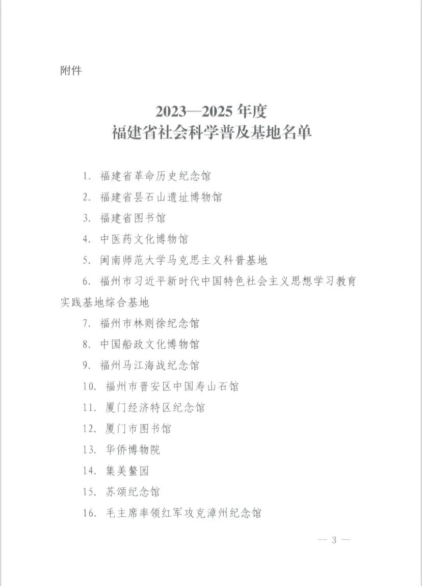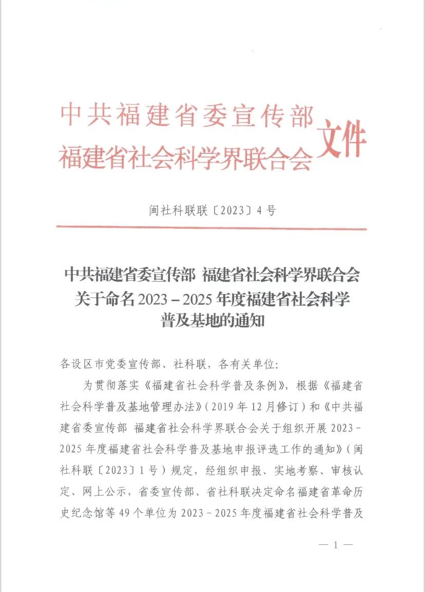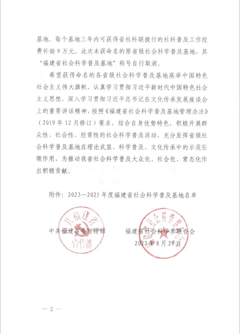 根据省委宣传部、省社科联文件《中共福建省委宣传部 福建省社会科学界联合会关于命名2023-2025年度福建省社会科学普及基地的通知》,省委宣传部、省社科联决定命名木兰溪治理展示馆等49个单位为2023-2025年度福建省社会科学普及基地。