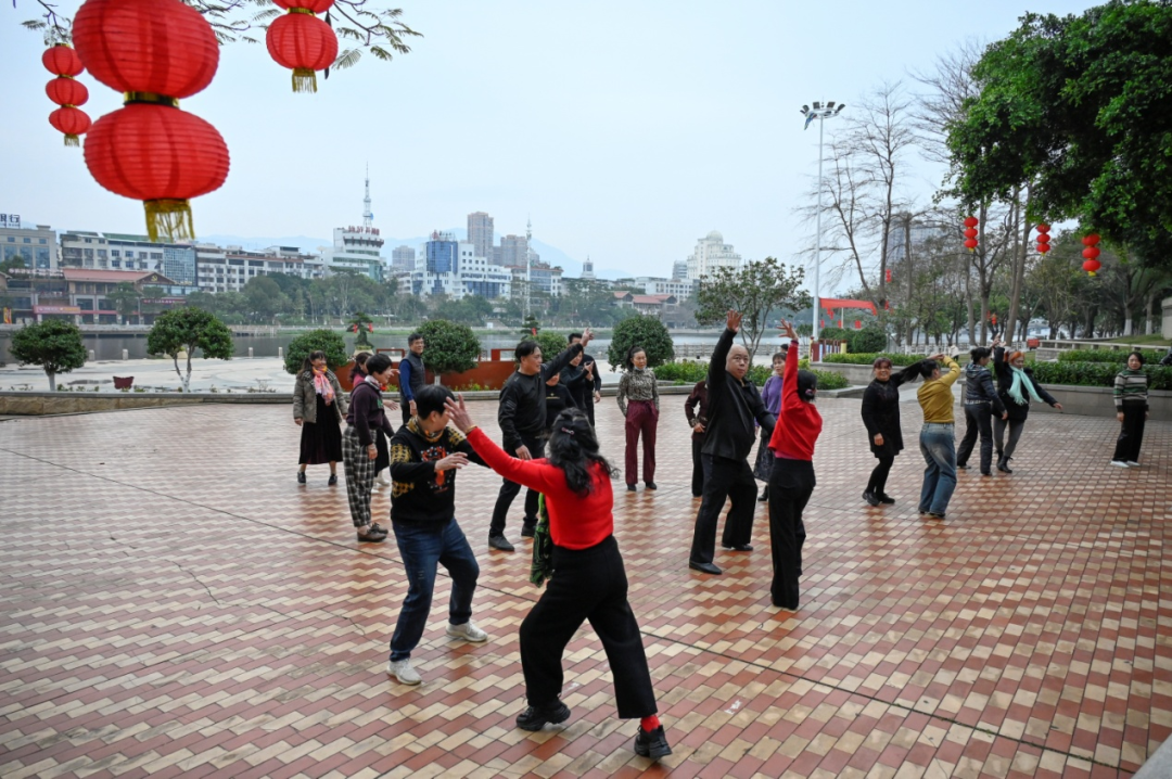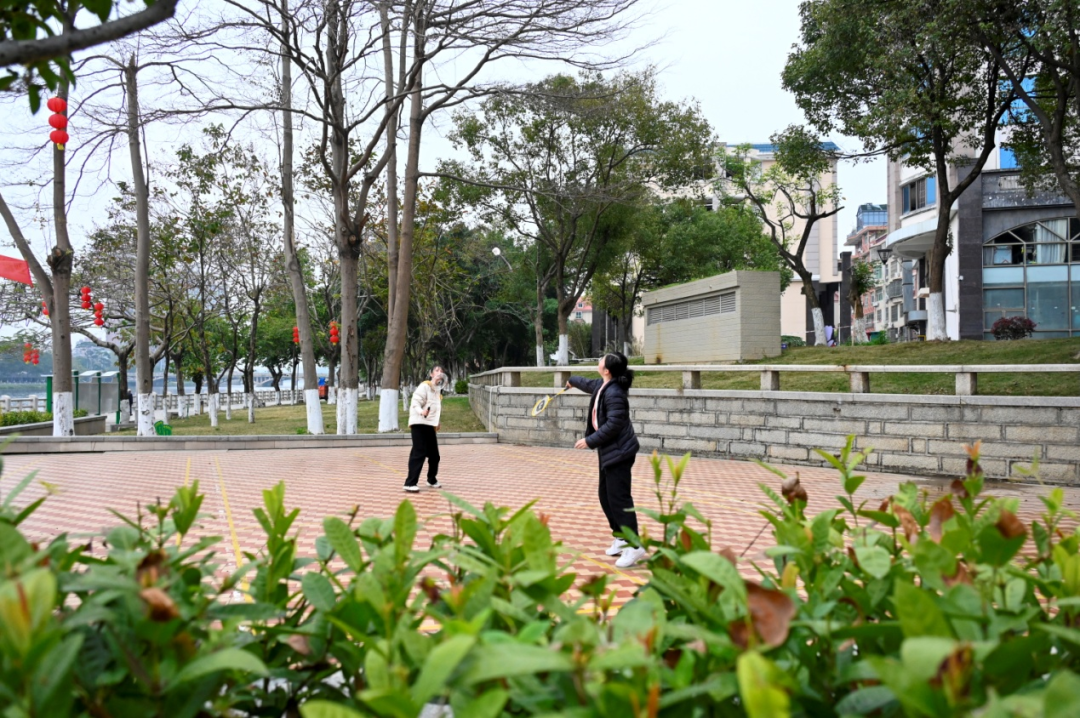 行走在木兰溪金威生态公园,可谓风景这边独好。穿行公园的木兰溪微荡漾,溪面白鹭翩飞,溪畔青草茵茵、树木青绿,一串串红灯笼点缀在树枝间。正值周末,人们聚集在此,打羽毛球、跳广场舞、跑步健身……一幅幅运动图景,为木兰溪增添活力。