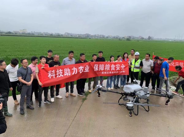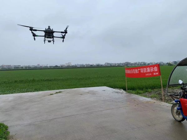 在丰隆农机专业合作社水稻生产基地,现场观摩无人机喷药作业,由大疆无人机技术代表和受训机手进行操作演示。据现场介绍,大疆T60农业无人飞机今年的旗舰机,具有高度智能化、自动性特点,操作简单方便,设计的流量更精准、播幅更大,可用于喷药、撒肥及水稻、油菜籽、草籽播种,农田、山林、水产养殖等作业场景都可覆盖。在丰隆农机合作社教室,举行区域性农机社会化示范服务中心农机技术培训,由无人机厂家技术人员详细讲解无人机的性能特点、操作要领及安全注意事项。