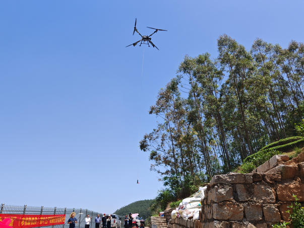 伴随着螺旋桨“嗡嗡”的蜂鸣声,极飞P150Pro搬运无人机载着一袋袋茶青从采摘区起飞,仅数十秒便精准降落在山脚的茶叶收集点。这种点对点直达的方式,可实现鲜叶“从茶园到车间”的无缝衔接,综合效率较人工提升15倍,极大的保障茶叶新鲜度。