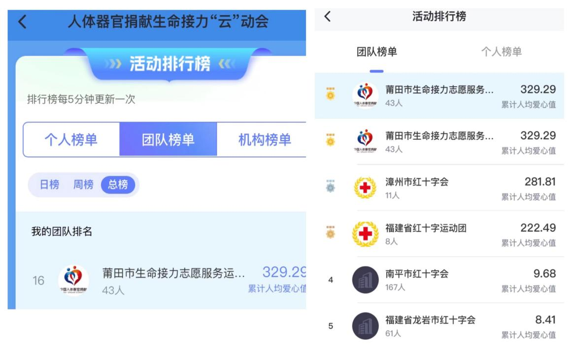 2023年5月8日,以“生命接力·大爱传递”为主题的人体器官捐献生命接力“云”动会正式启动。该运动会通过线上方式举办,采用“菜单式”的运动达标+地图行走的形式开展,志愿者完成运动达标后,解锁手机地图,可观看器官捐献爱心故事,累计爱心值形成榜单成绩。活动截止到6月7日,由我队运动团组成的生命接力志愿服务代表队首战告捷,取得了全国第16名,全省第1名的好成绩。“云”动会点亮里程碑里展示了莆田市红十字生命接力志愿服务队的主要事迹。