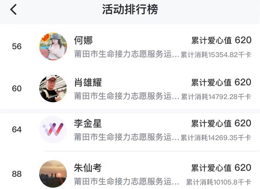 我队共117人志愿者加入“云”动会,43人进入最后冲刺,累计人均爱心值329.29。个人累计爱心值620分的有14人(何娜、肖雄耀、李金星、朱仙考、吴发焰、林昌、陈丽群、张雪华、李荔、陈丽、陈景琰、王剑铮、肖文彪、黄燕玉)。个人进入全国前100名的有何娜(排第56名),肖雄耀(排第60名),李金星(排第64名),朱仙考(排第88名),按比赛规则何娜、肖雄耀、李金星有望获全国个人三等奖。