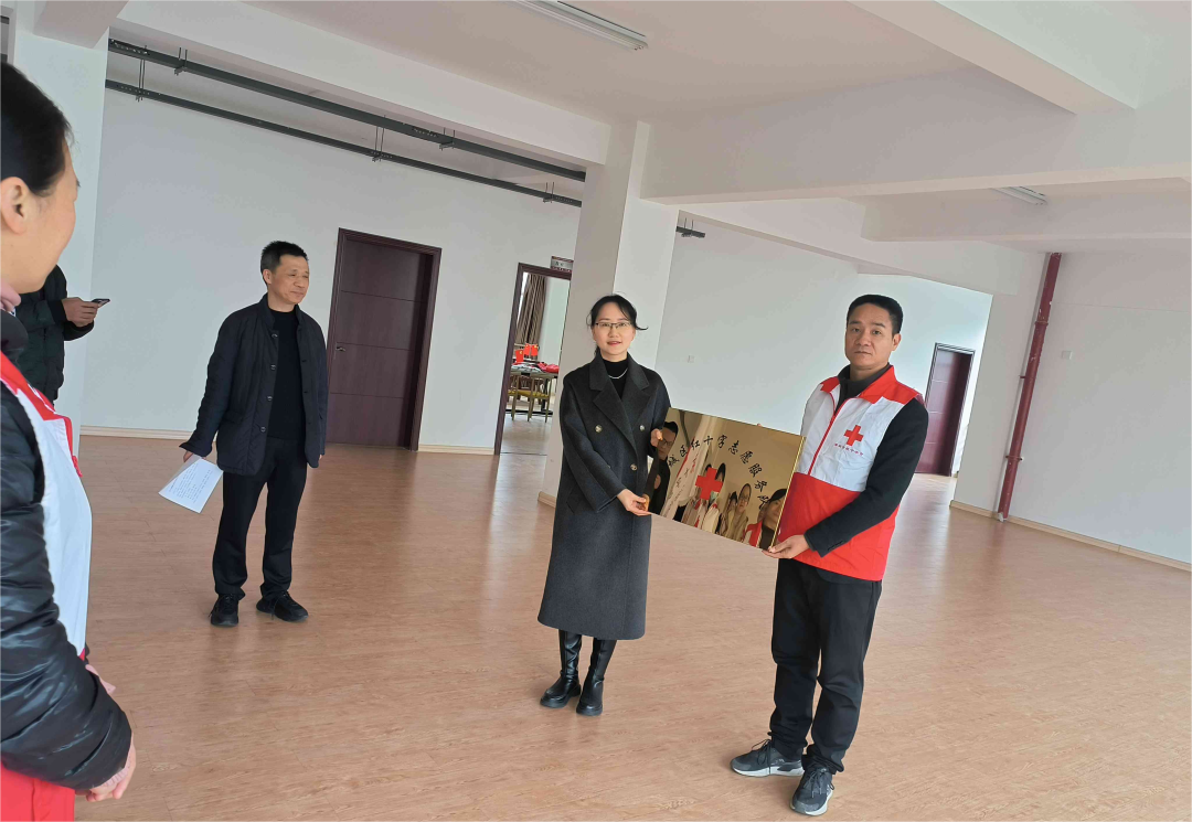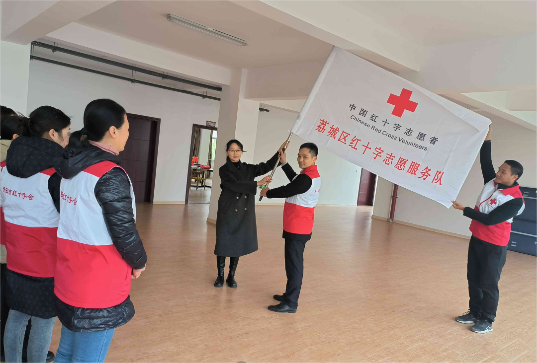荔城区红十字会常务副会长薛佳娇分别向新任队长及副队长授予队旗与队牌,并用“三喜”同至与各位志愿者共勉: