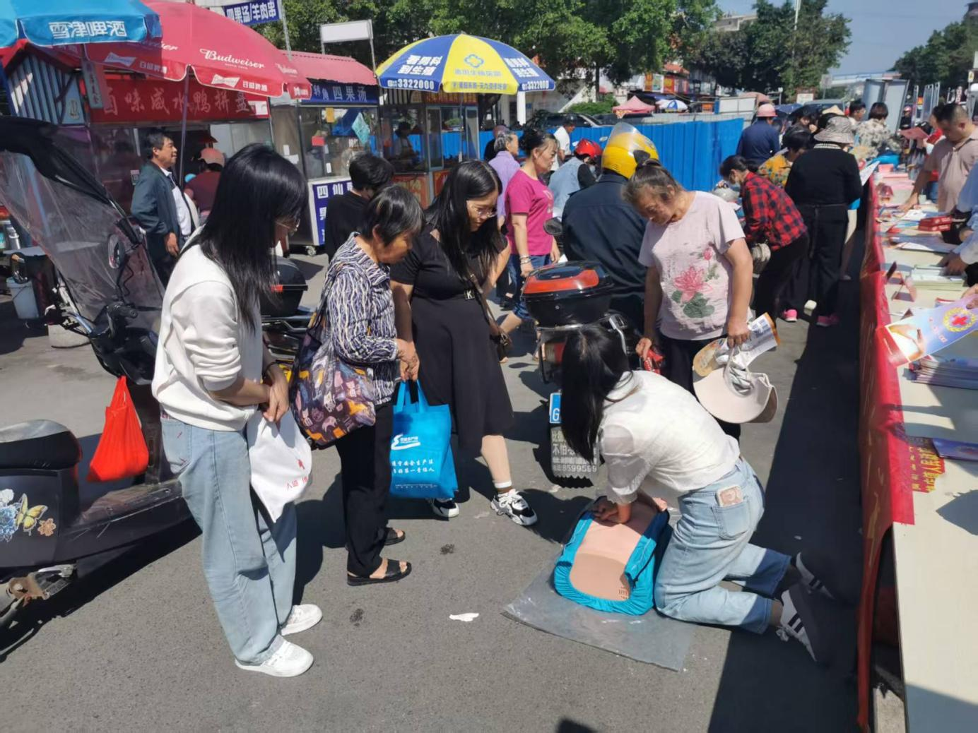 5月12日上午,在赖店镇参与“5.12”全国防灾减灾日现场宣传咨询活动,现场为群众普及应急救护知识和技能,分发生命健康知识宣传材料并接受群众咨询。