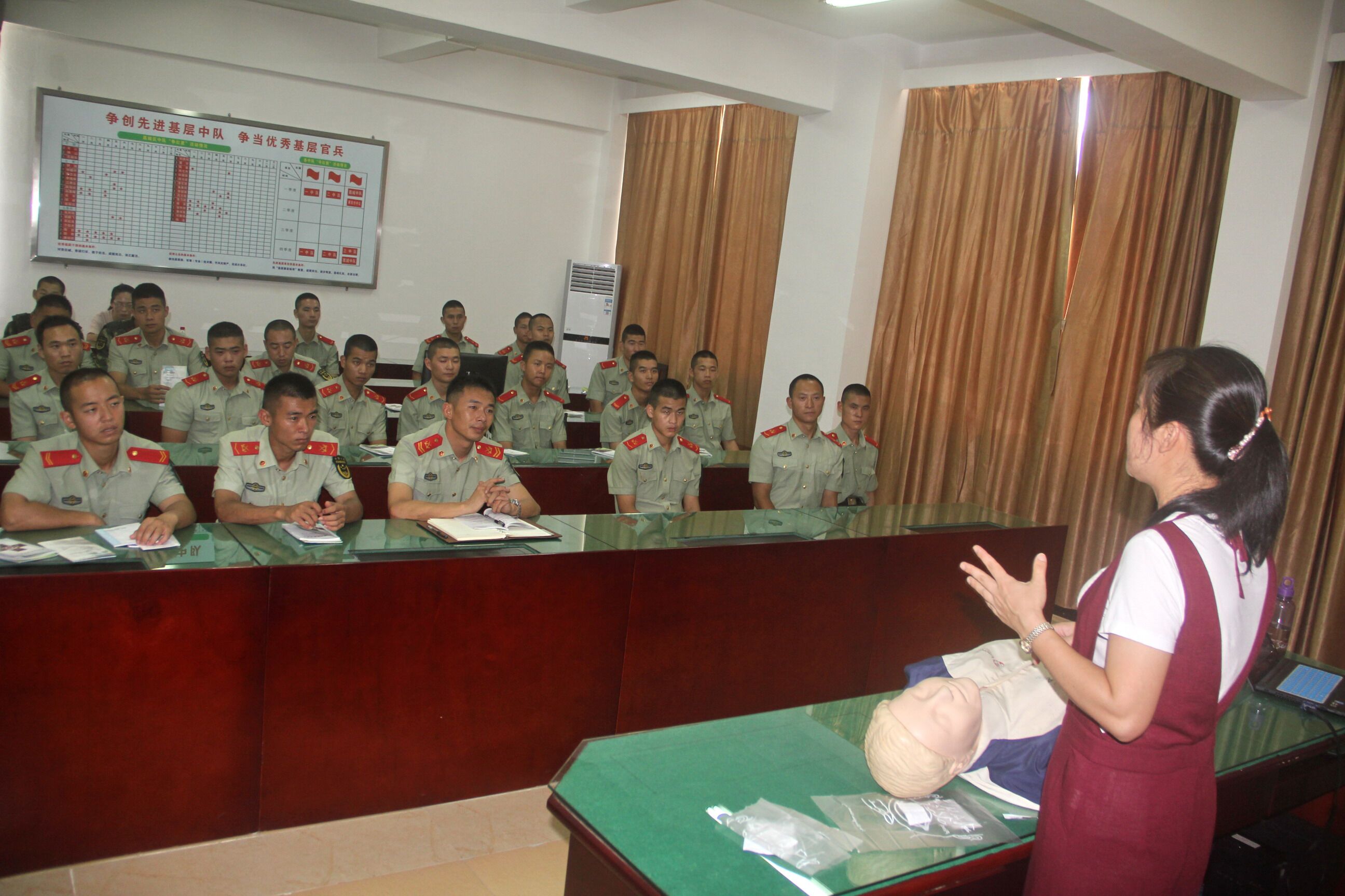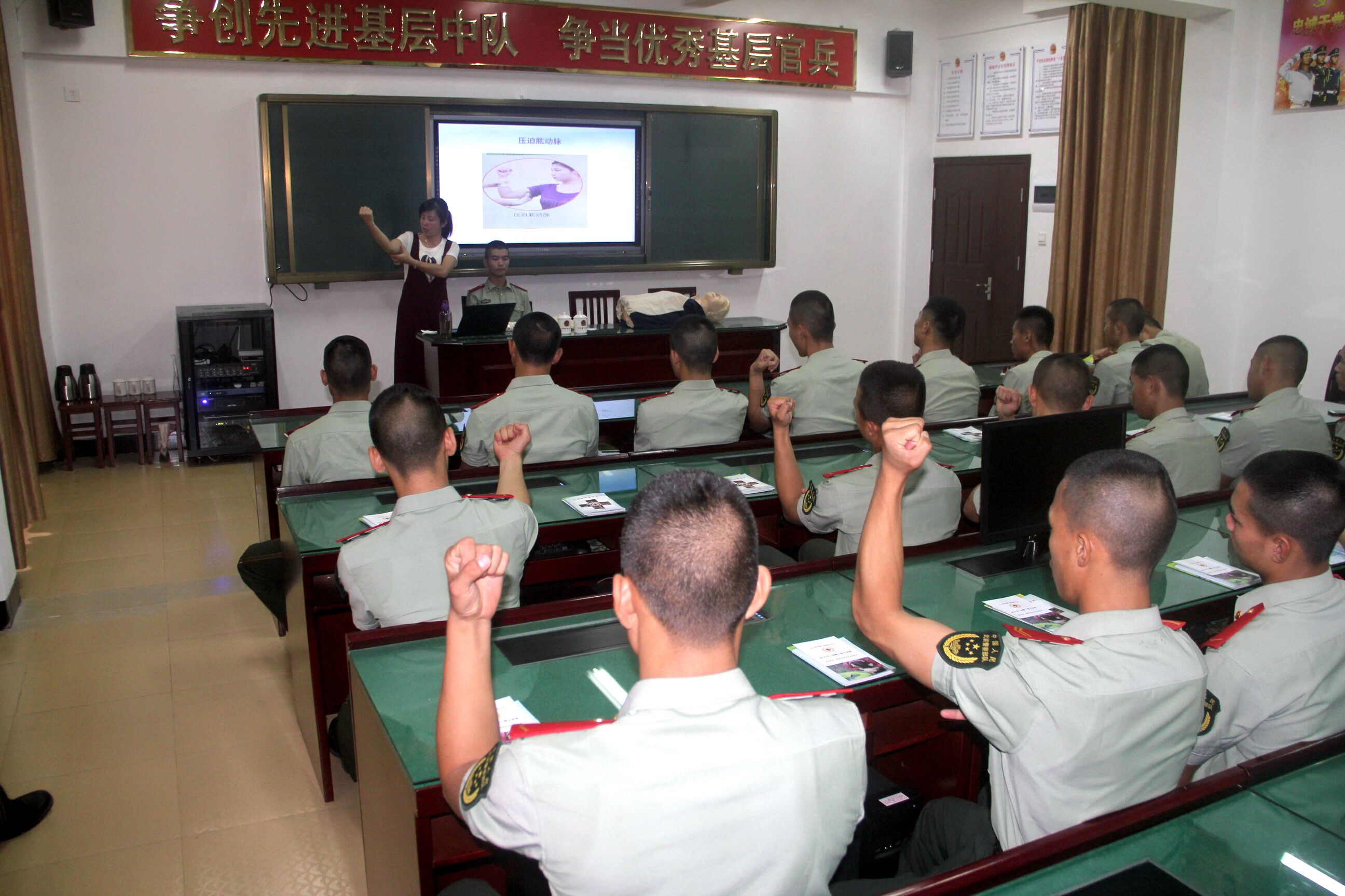 培训老师现场进行创伤救护、心肺复苏、止血包扎固定、意外伤害处理等实操培训,与官兵们互动练习,并赠送《现场初级救护常识》、《红十字急救掌上学堂》等急救小册子300册,让官兵们感到受益匪浅。
