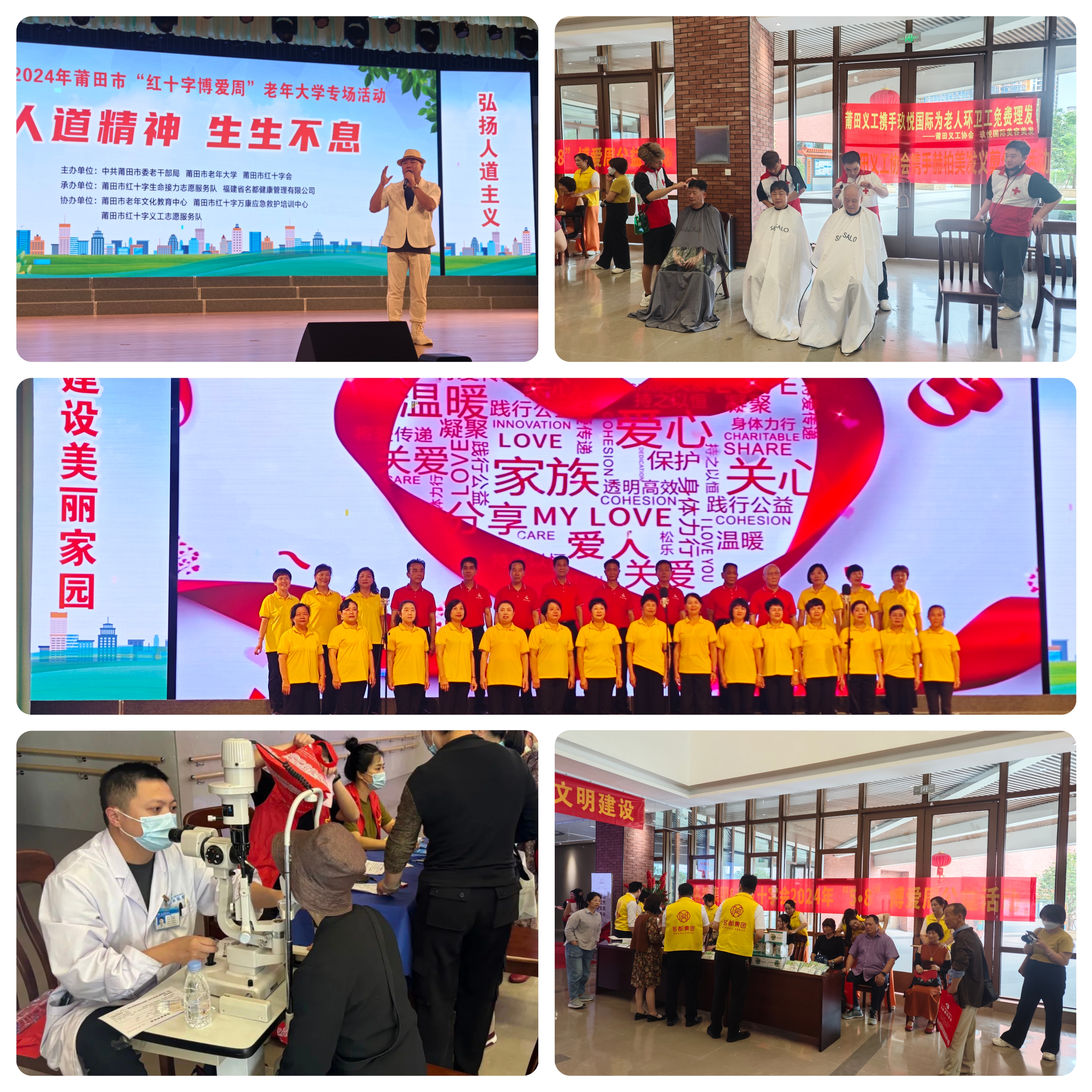 5月9日,以“人道精神 生生不息”为主题的2024年莆田市“红十字博爱周”主题宣传活动在市老年文体教育中心举行。市老年大学、红十字会相关负责人、学员代表、志愿者、演职人员等近200人参与活动。活动现场播放了宣传片《一个人的篮球队》、演唱原创公益歌曲《三月廿三拜妈祖》、表演了歌伴舞《生命的接力》等节目。现场还开展了按摩理疗、义剪、眼科义诊志愿服务活动。