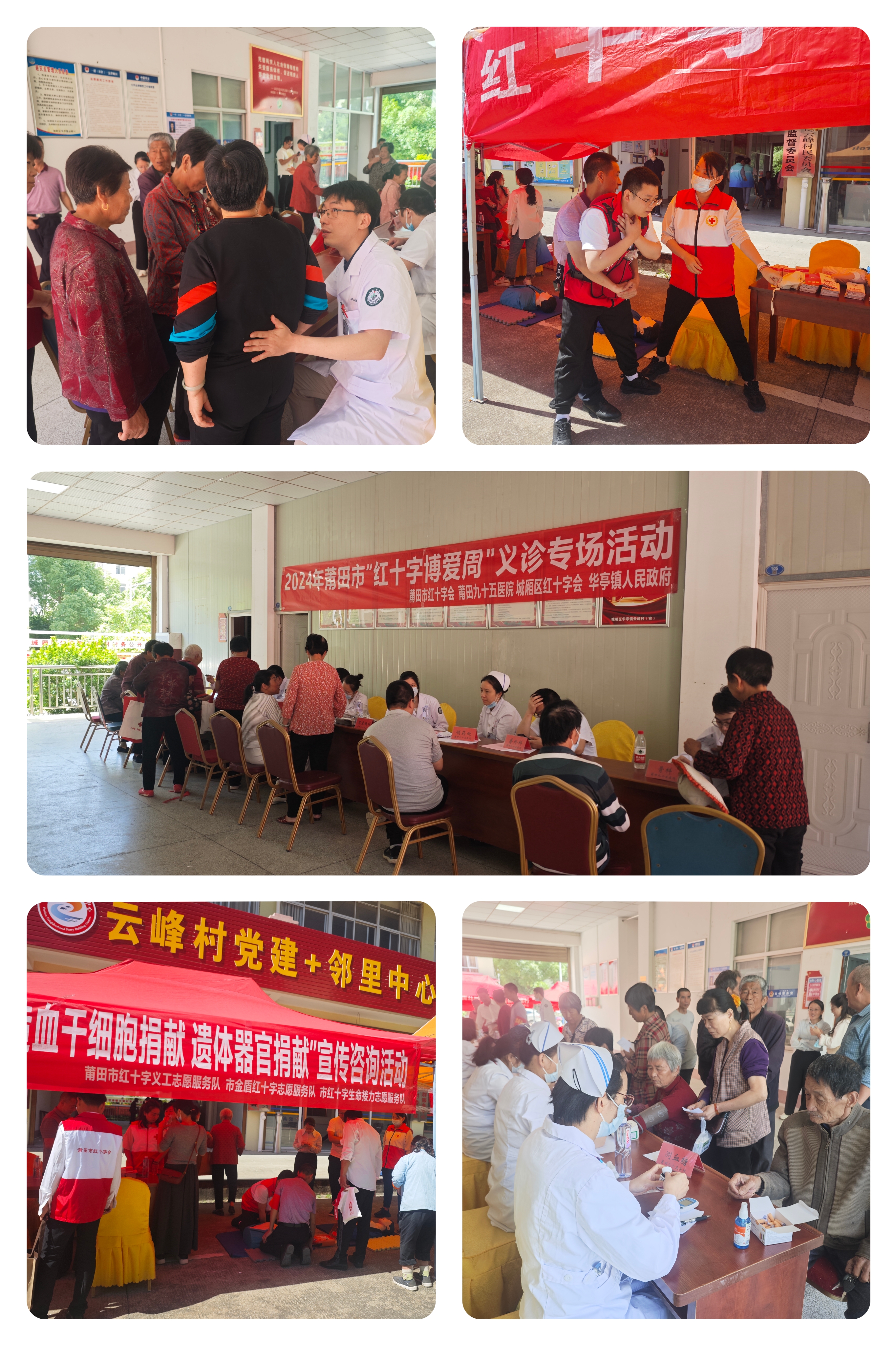 5月14日,由市红十字会、莆田九十五医院、华亭镇人民政府联合主办的2024年莆田市“红十字博爱周”大型义诊专场活动在华亭镇云峰村幸福家园一期举行。活动现场,医护志愿者们耐心细致地为群众提供骨科、妇科、产科、内外科等诊断、咨询服务,并根据检查情况给出治疗建议,免费为现场百余名群众进行血压、血糖、DR、彩超、心电图常规检查并发放药品,让群众享受家门口的三甲医院实实在在的健康服务。同时,现场红十字志愿者还为群众开展了心肺复苏、气道异物梗阻急救技能普及、宣传“三救三献”、金融反诈等基本知识。