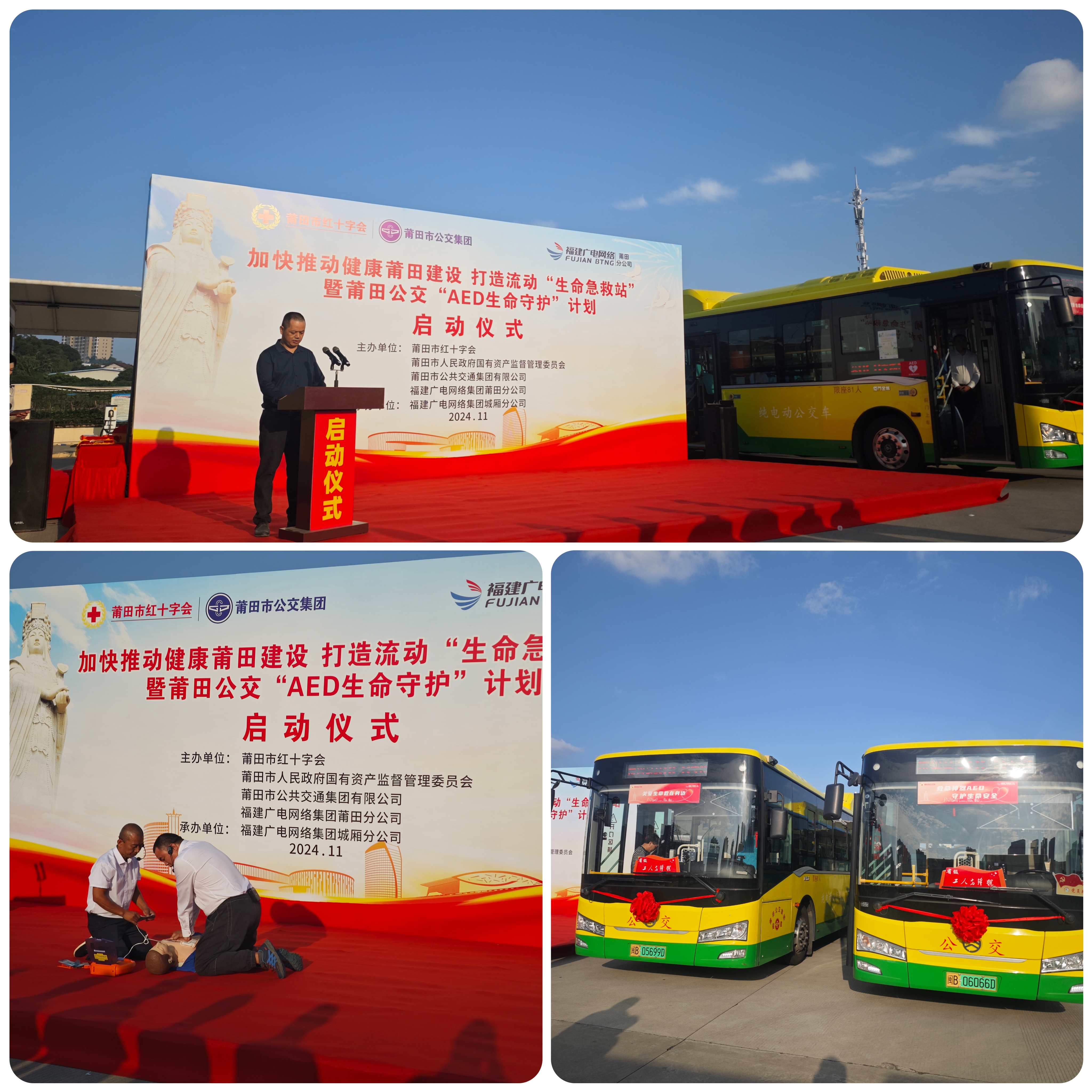 活动现场介绍“AED生命守护”计划情况,市公交集团司机代表现场模拟公交场景开展心肺复苏及AED使用演练,并为首发莆田公交AED专线揭幕。