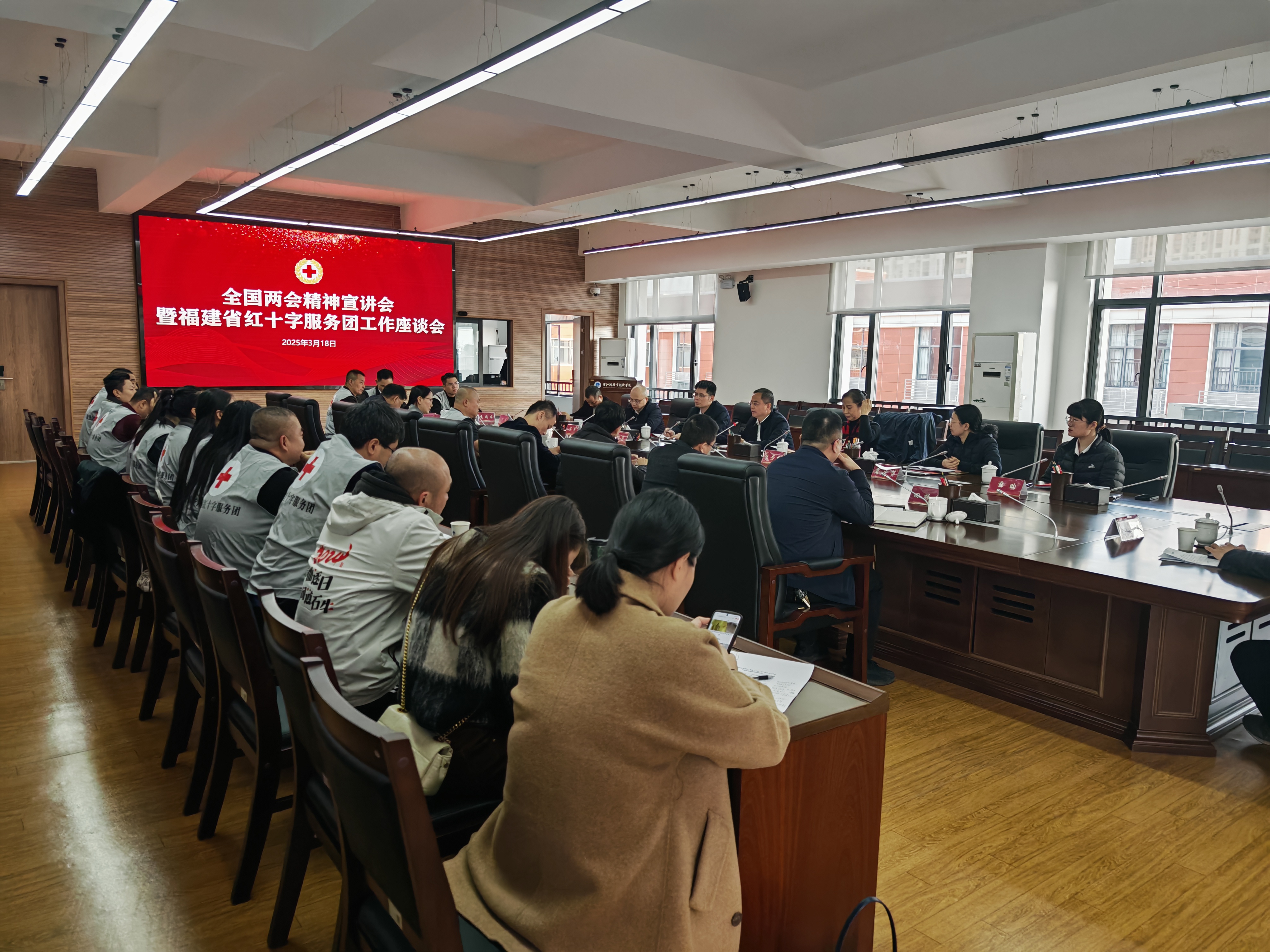 最后,何书记为与会人员宣讲了全国两会精神。他指出2025年全国“两会”是在“十四五”规划收官之年、“十五五”谋划的承上启下之年召开的一次盛会,对全面建成社会主义现代化强国、实现第二个百年奋斗目标,以中国式现代化全面推进中华民族伟大复兴而努力奋斗具有重要而深远的意义。他强调全省红十字系统要把两会精神学习与贯彻习近平总书记关于红十字事业的重要批示指示和重要致信精神结合起来,与推动红十字事业的高质量发展结合起来,进一步牢固树立以人民为中心的发展思想,持续深化开展“三争”行动,聚焦“三救三献”主责主业,积极开展人道救助,着力提升人道服务水平,加强自身能力建设,为更好发挥党和政府在人道领域联系服务群众的桥梁纽带作用奠定坚实基础,为福建在中国式现代化建设中奋勇争先贡献人道力量。