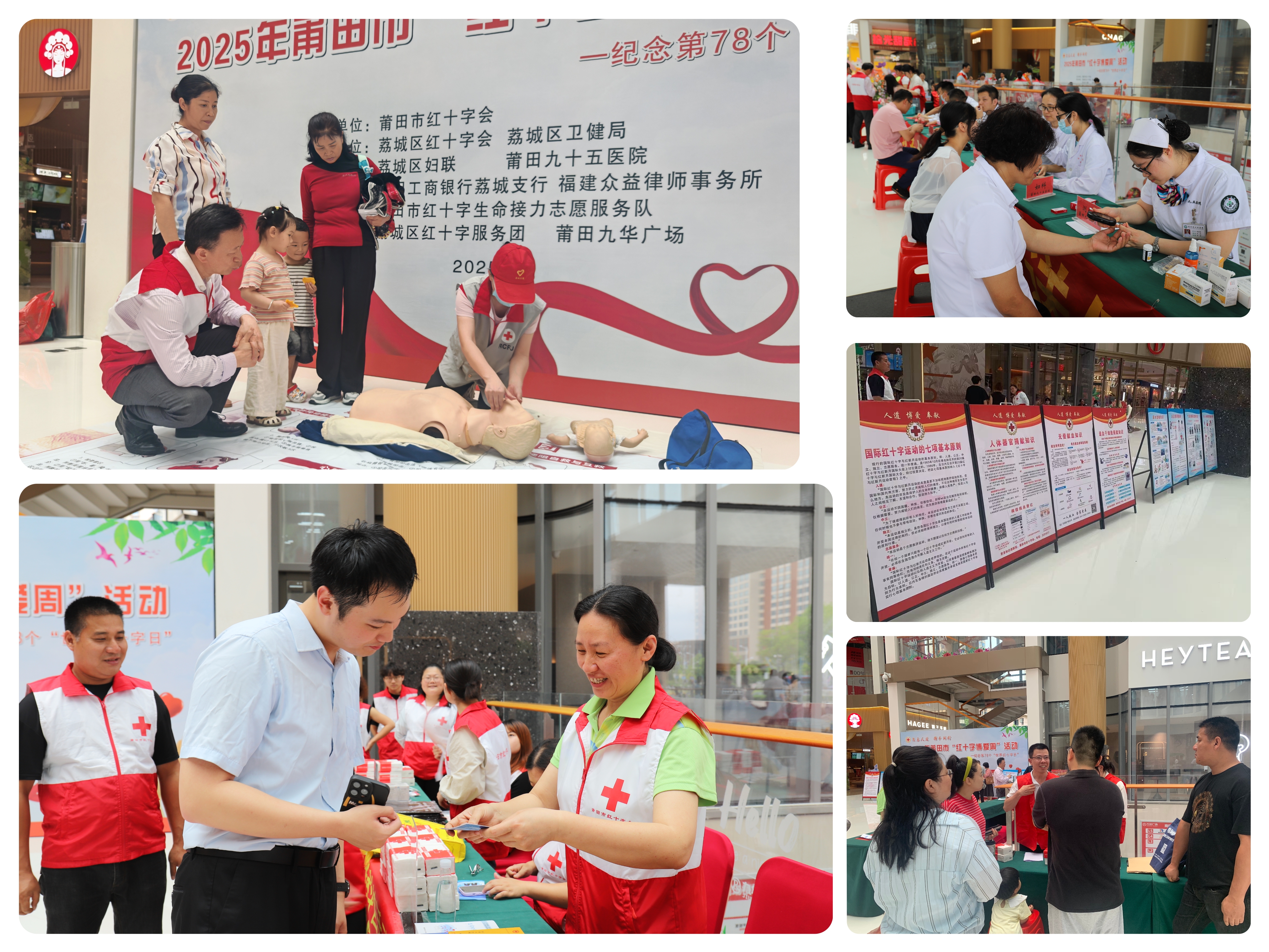 今年莆田市“红十字博爱周”活动主题为“矢志人道 携手同行”。活动现场,荔城区红十字会、荔城区妇联、莆田市九十五医院、莆田工商银行荔城支行、福建众益律师事务所、莆田市红十字生命接力志愿服务队、市红十字无偿献血、造干宣传志愿服务队等单位通过设置宣传台、宣传展板、讲解示范区,向过往群众普及宣传“救在身边、守护生命”应急救护知识、无偿献血科普知识和造血干细胞、人体器官捐献知识等,开展健康义诊、“暖新呵护·健康同行”“三新”领域女性健康关爱行动、金融反诈宣传、公益法律咨询服务等,并现场互动教学心肺复苏(CPR)、海姆立克急救法,提高群众安全防范意识和自救互救能力。