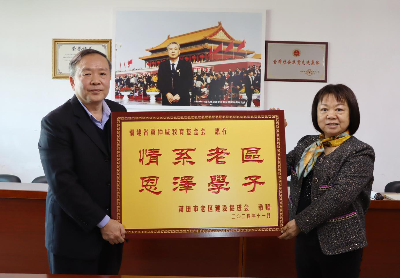 莆田市老区建设促进会王玉宝会长向福建省黄仲咸教育基金会敬赠牌匾。